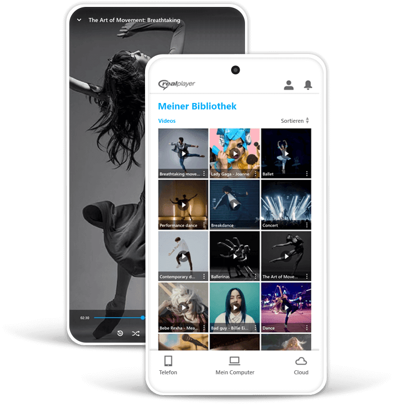 - Greift von überall auf die RealPlayer PC-Bibliothek zu